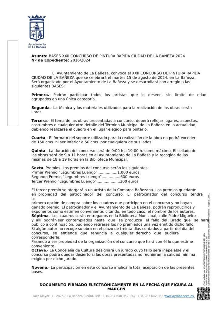 La Concejalía de Cultura del Ayuntamiento de La Bañeza acaba de publicar las bases del XXII Concurso de Pintura Rápida “Ciudad de La Bañeza”, un concurso que pintura que forma parte del programa de Fiestas Patronales en honor de Nuestra Señora de la Asunción y San Roque y, que como viene siendo tradición, se celebra durante el día 15 de agosto.