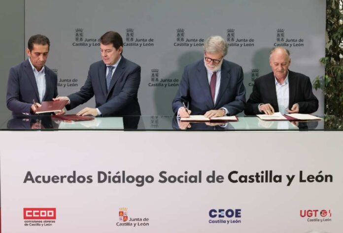En el Consejo del Diálogo Social de Castilla y León, celebrado hoy en la sede de la Presidencia, el presidente del Gobierno autonómico, Alfonso Fernández Mañueco, ha firmado cuatro nuevos acuerdos en materia de Vivienda, Dependencia, Educación y Transición Justa con el presidente de CEOE Castilla y León, Santiago Aparicio; y los secretarios autonómicos de CCOO, Vicente Andrés y UGT, Fautisno Temprano. El objetivo es generar oportunidades, sobre todo, para las familias, las personas mayores y los jóvenes.