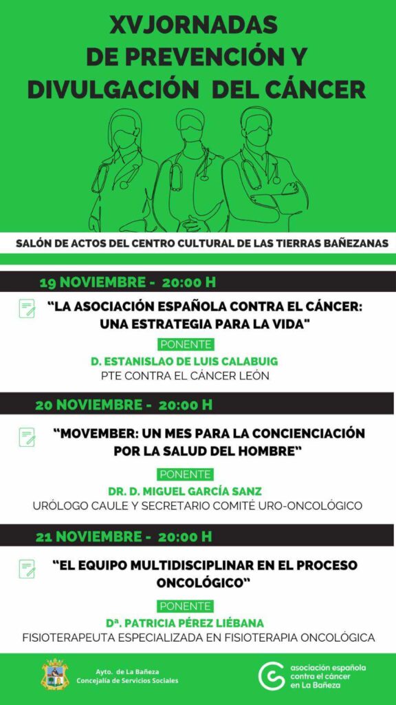 La Junta Local de la Asociación Española Contra el Cáncer (AECC) de La Bañeza llevará a cabo las XV Jornadas de Prevención y Divulgación del Cáncer los días 19, 20 y 21 de noviembre. Las jornadas incluirán charlas cada día a las 20:00 horas, en el Salón de Actos del Centro Cultural de las Tierras Bañezanas, abiertas a todos los públicos.