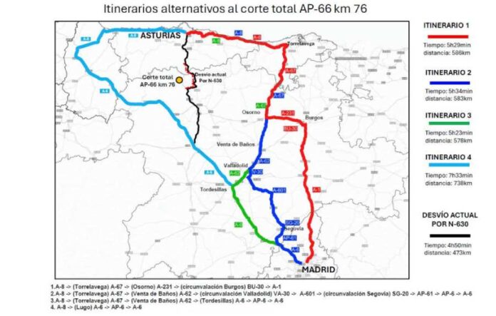 Debido al desprendimiento de ladera ocurrido este domingo en el kilómetro 76 de la autopista AP-66 que ha provocado la interrupción de la conexión entre ambos territorios por la citada vía, en estos momentos la única vía de comunicación entre estas comunidades es la carretera N-630.