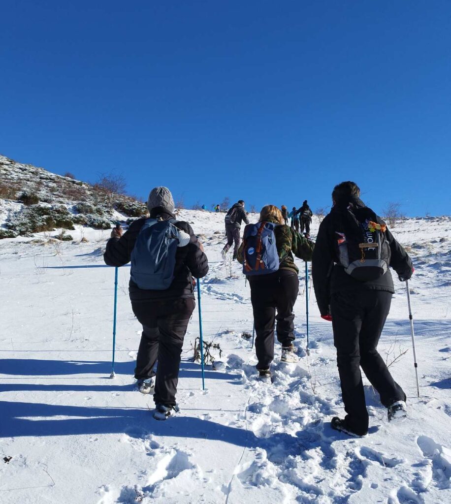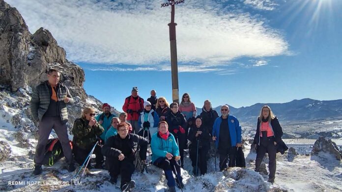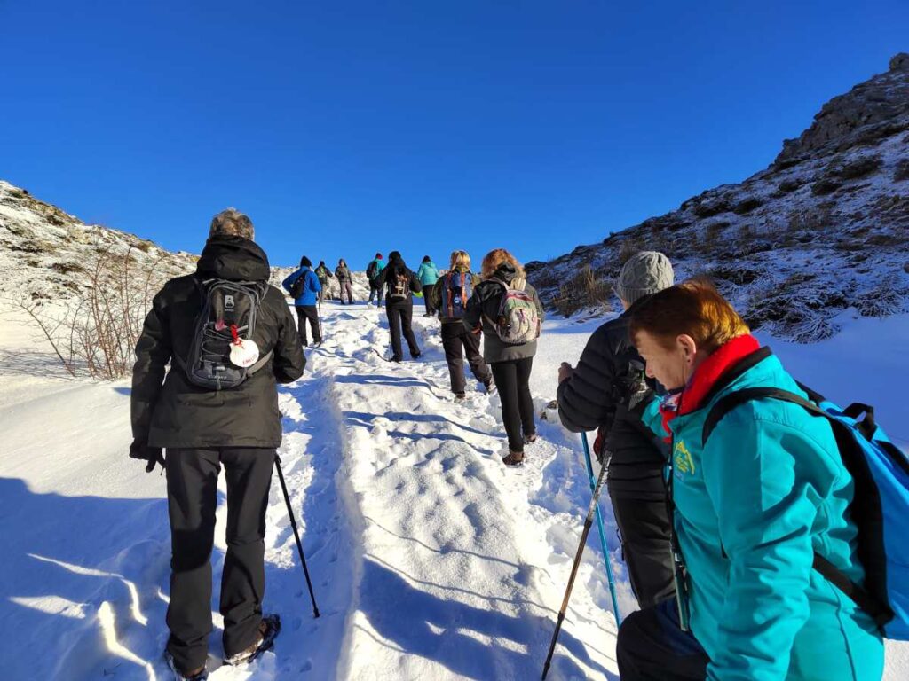 Tras superar la primera gran ascensión, el grupo se adentró en una extensa pradera donde, en ocasiones, se hundían hasta la rodilla en la nieve. Posteriormente, el camino volvió a inclinarse hacia arriba, y en la distancia apareció la Cruz del Salvador sobre un risco, marcando el siguiente objetivo. La última parte de la subida resultó especialmente empinada y resbaladiza, pero finalmente todos lograron llegar. Desde allí, aprovecharon para hacer una breve pausa y disfrutar de las impresionantes vistas antes de iniciar el descenso por un hermoso valle.