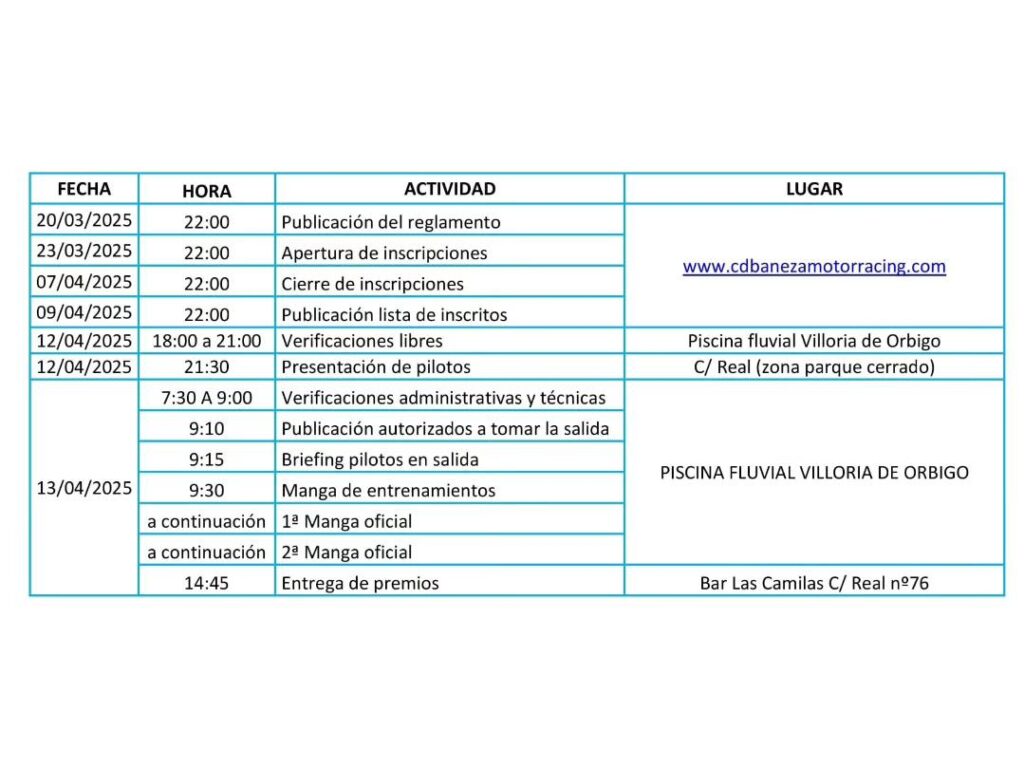 El evento arrancará el sábado 12 de abril con las verificaciones libres, que se llevarán a cabo en la Piscina Fluvial de Villoria entre las 18:00 y las 21:00 horas. Posteriormente, a las 21:30 horas, se celebrará la presentación oficial de los pilotos en la plaza del pueblo, donde los aficionados podrán conocer de cerca a los participantes.