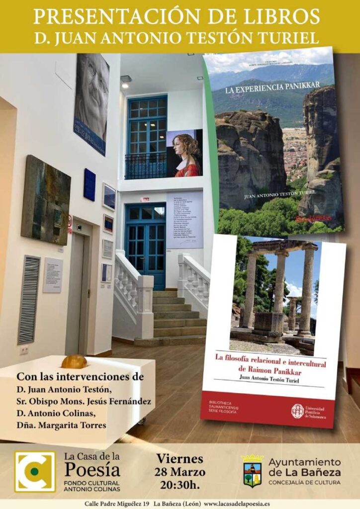 La Casa de la Poesía Fondo Cultural Antonio Colinas de La Bañeza será el escenario, el próximo viernes 28 de marzo a las 20:30 horas, de la presentación de dos libros del escritor bañezano Juan Antonio Testón Turiel: La experiencia Panikkar y La filosofía relacional e intercultural de Raimon Panikkar.