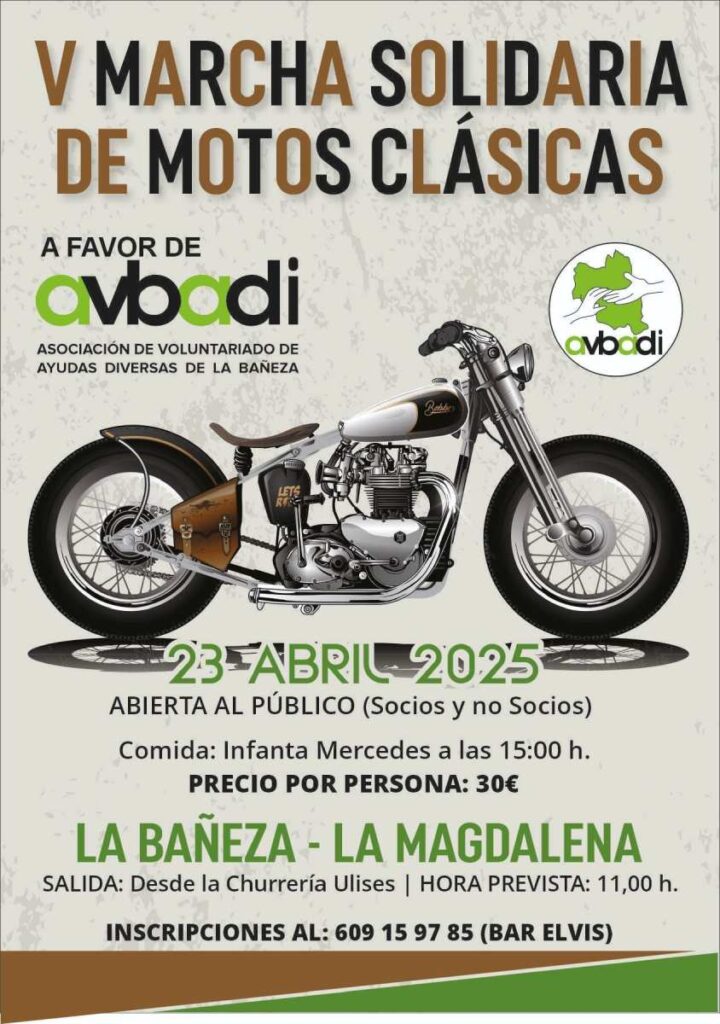 La ciudad de La Bañeza volverá a rugir con motores clásicos el próximo 23 de abril con la celebración de la V Marcha Solidaria de Motos Clásicas, un evento benéfico a favor de la Asociación de Voluntariado de Ayudas Diversas de La Bañeza (AVBADI).
