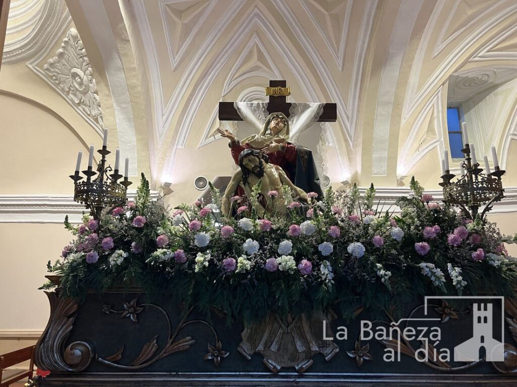 El Vía-Crucis se celebró finalmente dentro del templo, donde se rezaron las 14 estaciones en un ambiente de recogimiento y devoción, guiado por los sacerdotes de la parroquia bañezana, Don Jerónimo Martínez Franco y Don Jaime Marulanda. Las imágenes presentes en este acto fueron el Cristo de la Agonía (Crucificado tendido), Jesús Crucificado, Nuestra Señora de la Piedad y Nuestra Señora de la Soledad.