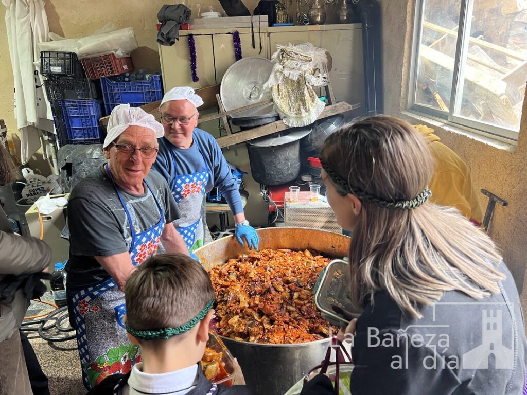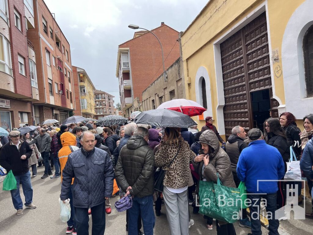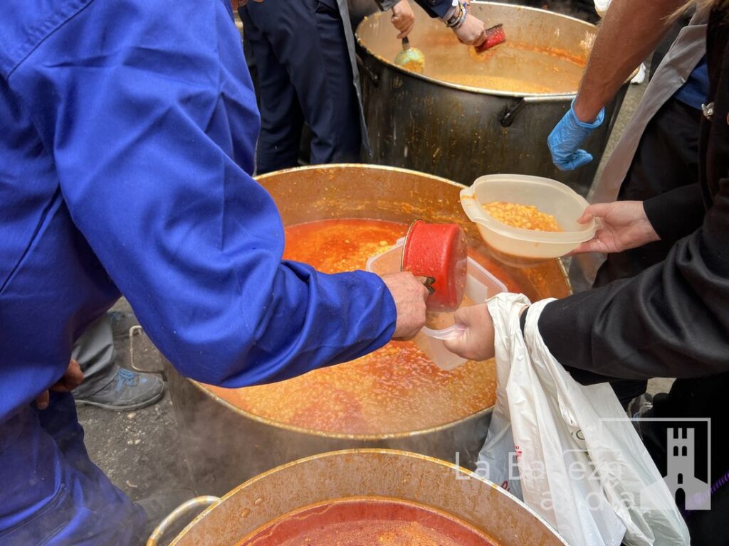 A pesar de los chaparrones intermitentes, cientos de personas aguardaban pacientemente su turno, fiambrera en mano, para recoger una ración del ya famoso potaje. Este año, la cofradía preparó comida para más de 4.000 comensales, con un guiso elaborado a base de 300 kilos de garbanzos, 210 de bacalao y 120 de arroz.