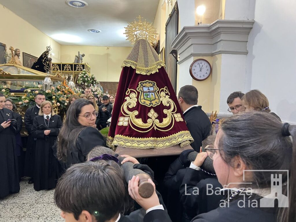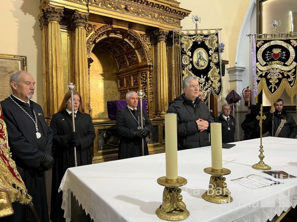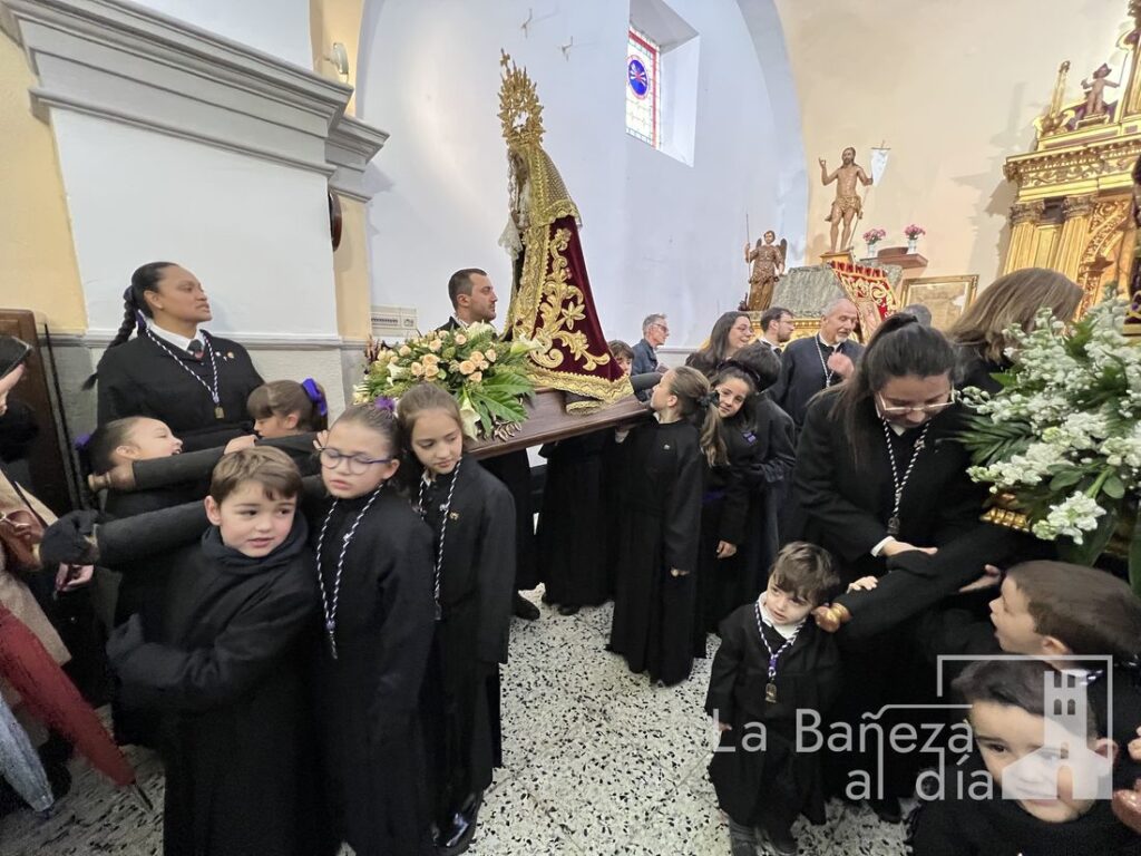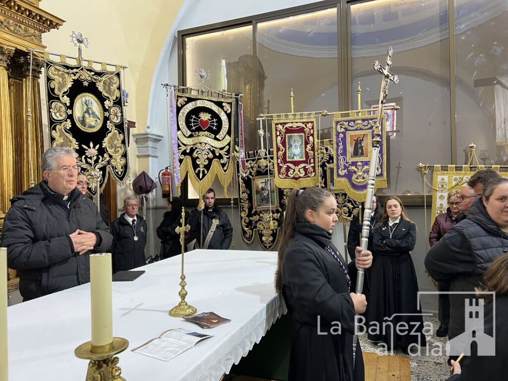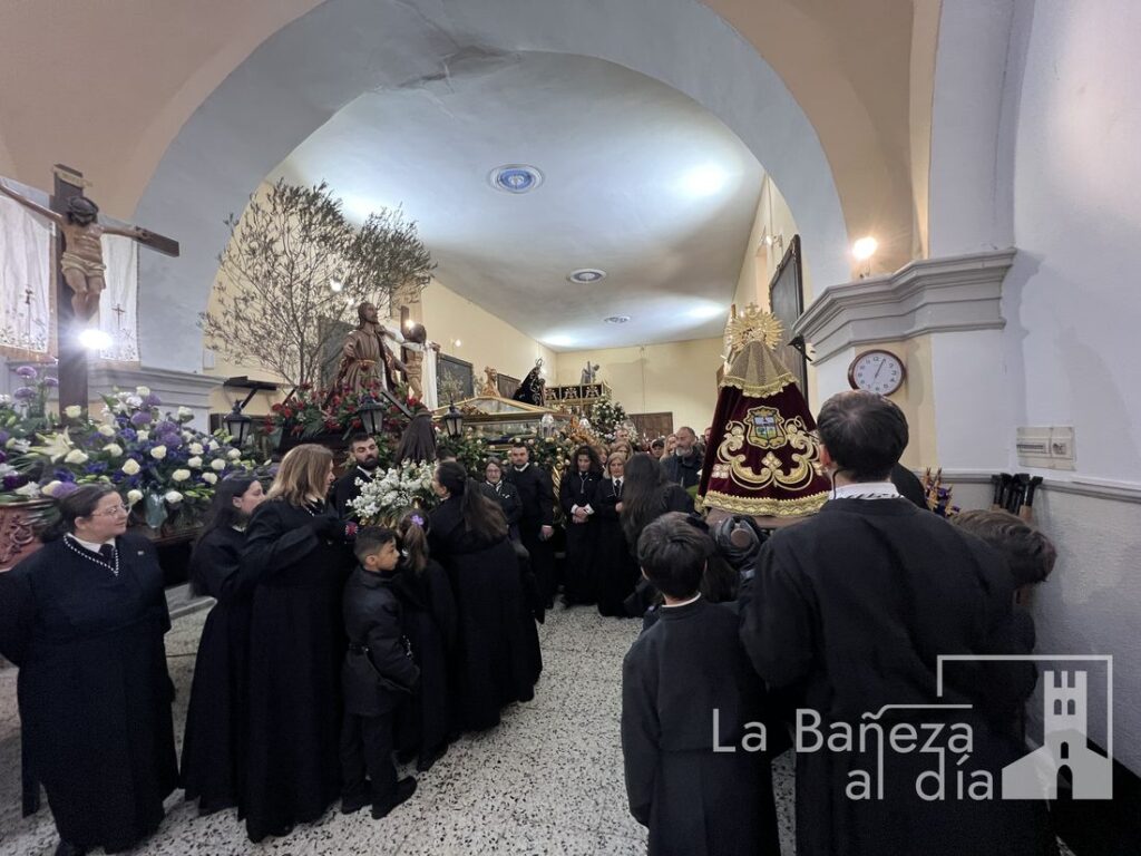 Aunque la intensa lluvia caída desde el mediodía obligó a suspender la procesión prevista para la tarde de este Viernes Santo, la Cofradía de Nuestra Señora de las Angustias y Soledad de La Bañeza celebró un acto en la capilla, demostrando que ni el mal tiempo puede apagar el fervor de la Semana Santa bañezana.