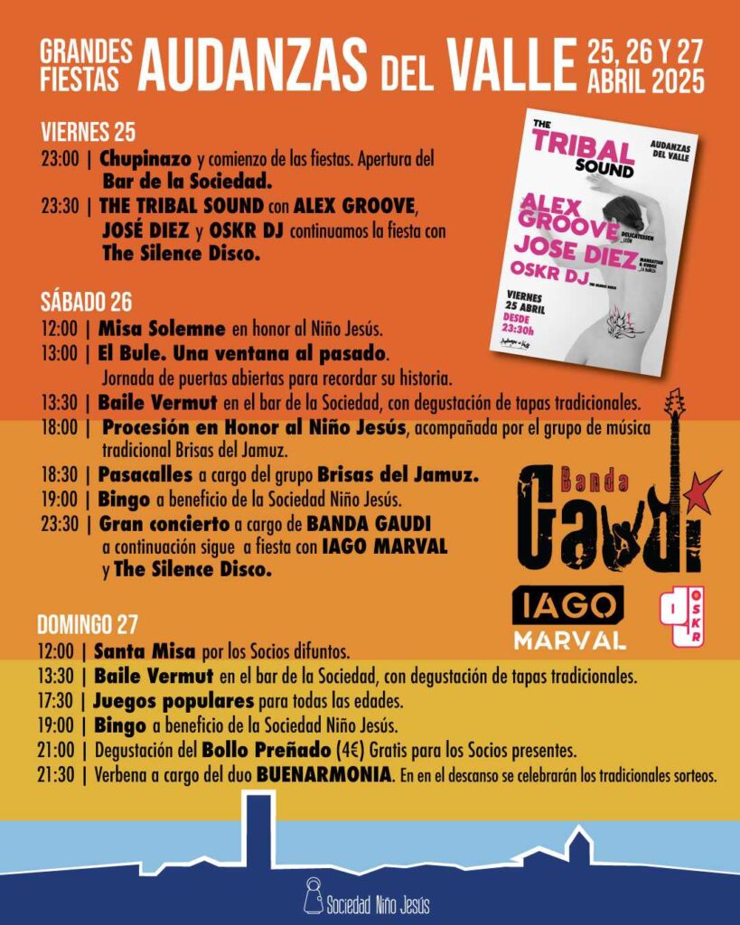Los actos comenzarán el viernes 25 de abril, con la apertura del Bar de la Sociedad y el regreso del mítico festival de música remember y techno The Tribal Sound, con la actuación de los conocidos DJ’s Alex Groove, Jose Díez y Oskr DJ. A su finalización, continuará la fiesta con The Silence Disco.