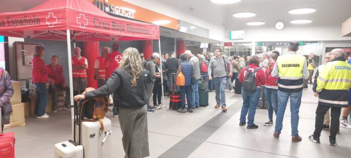 Los voluntarios de Cruz Roja, provistos de agua, zumos y diversos alimentos, se han desplazado hasta el punto exacto en el que se encontraba el convoy con vehículos adaptados a las dificultades del terreno para proporcionar apoyo y ayudar en las labores de evacuación de todos los pasajeros, especialmente de los más vulnerables, hasta la estación.