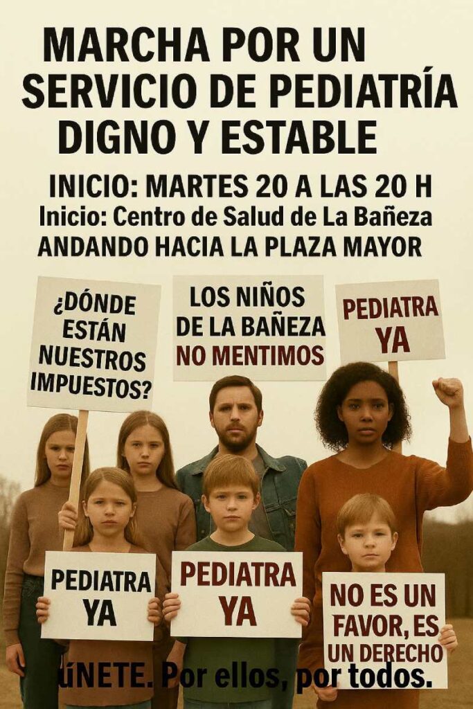 Los lemas del cartel de la convocatoria reflejan el malestar creciente de las familias afectadas: “¿Dónde están nuestros impuestos?”, “No es un favor, es un derecho”, “Los niños de La Bañeza no mentimos” o el contundente “Pediatra ya”.