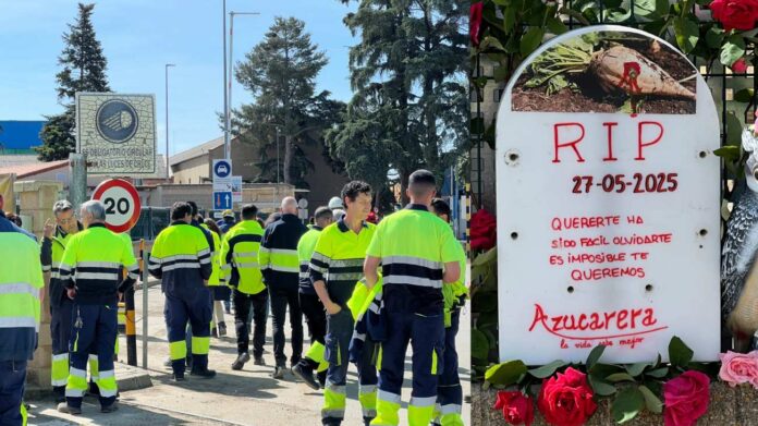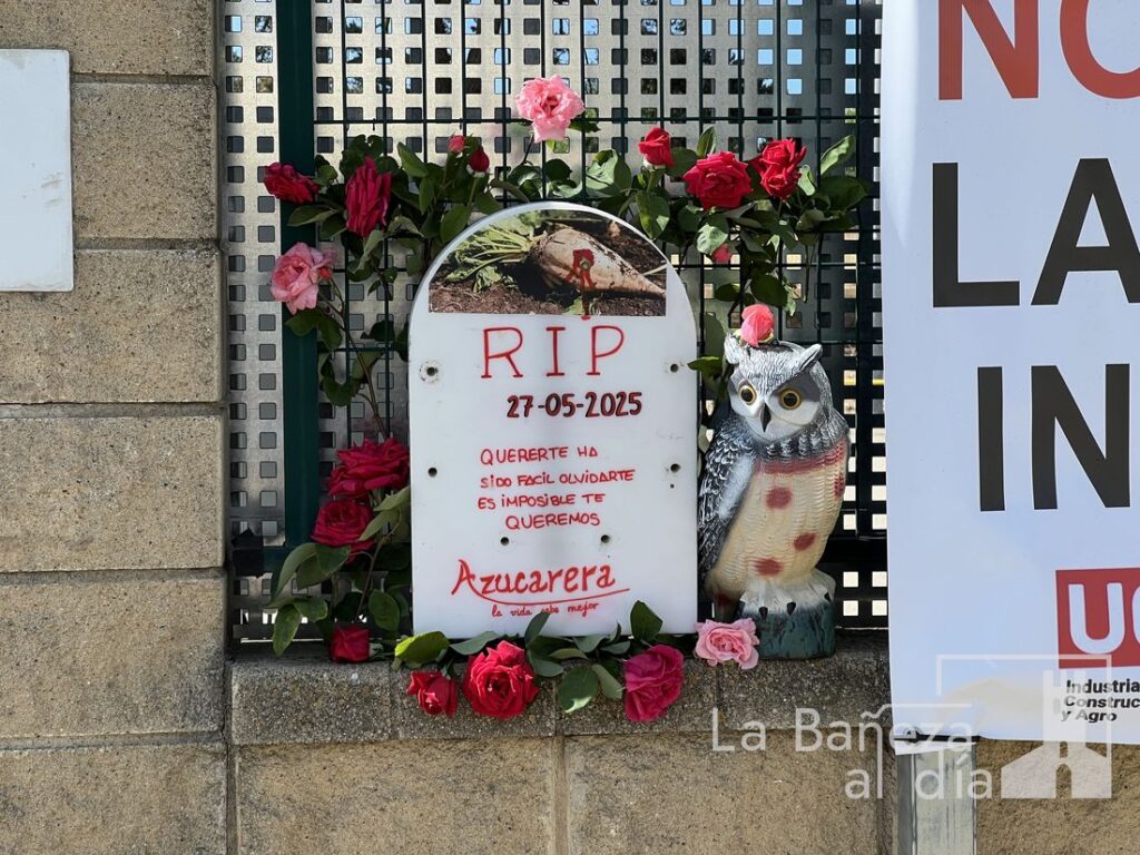 La escena frente a la planta ha estado marcada por un símbolo cargado de emoción: una lápida simbólica construida por Samuel Álvarez y varios de sus compañeros, adornada con flores y el dibujo de una remolacha. En ella podía leerse el mensaje: