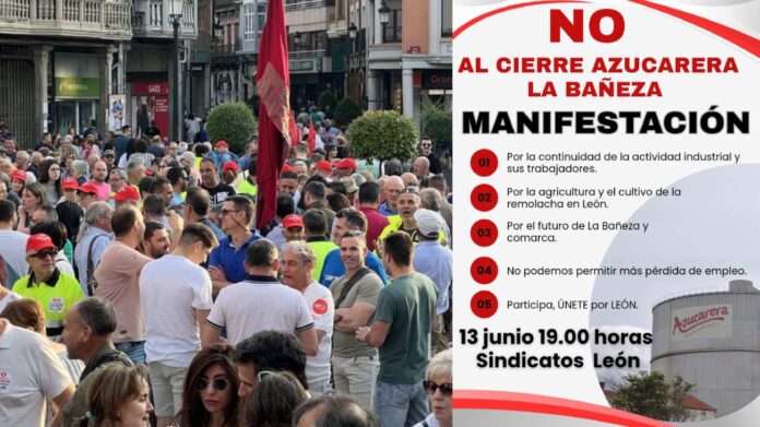 El grito de «NO al cierre de Azucarera en La Bañeza» resonará este viernes 13 de junio en el corazón de León. Trabajadores, sindicatos y ciudadanía se darán cita a las 19:00 horas en la Gran Vía de San Marcos para marchar hasta la sede de la delegación territorial de la Junta de Castilla y León, en la avenida de los Peregrinos, en una manifestación que busca frenar el cierre de la histórica planta azucarera.