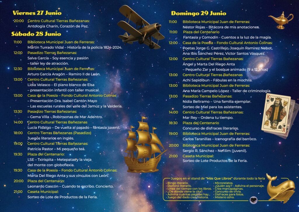 Como novedad, este año las casetas se ubicarán en la céntrica Plaza del Centenario, concentrando toda la actividad cultural en un mismo entorno, junto al Centro Cultural Tierras Bañezanas y la Casa de la Poesía. Lecturas, presentaciones, firmas de libros, juegos, concursos de disfraces y un sinfín de propuestas convertirán a La Bañeza en un punto de encuentro para amantes de la literatura de todas las edades.