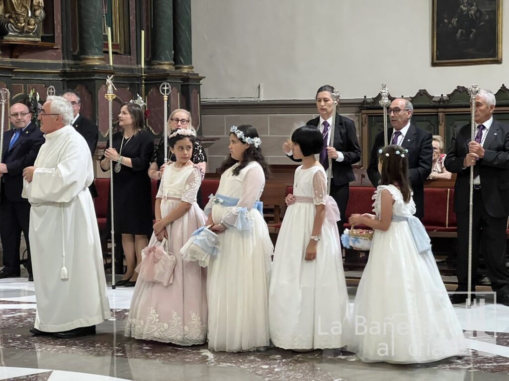 Uno de los momentos más emotivos se vivió al final del acto, cuando las niñas de comunión, vestidas con sus trajes blancos, no quisieron renunciar a una de las tradiciones más queridas: lanzar pétalos de flores. Lo hicieron en la calle, en un gesto simbólico que mantuvo viva la esencia de esta festividad, a pesar de la lluvia.