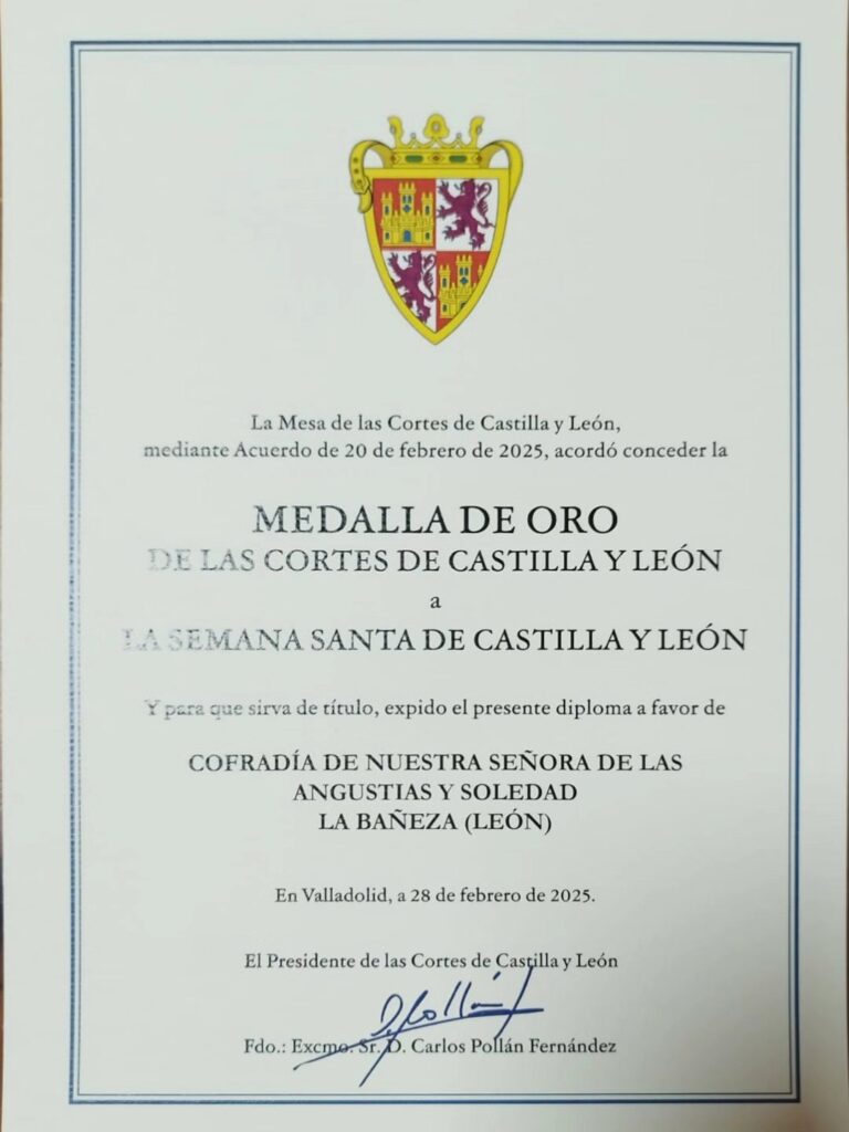La Cofradía de Nuestra Señora de las Angustias y Soledad de La Bañeza ha sido distinguida con la Medalla de Oro de las Cortes de Castilla y León, el mayor reconocimiento otorgado por la asamblea autonómica. Esta condecoración premia los méritos relevantes y los servicios destacados que la cofradía ha prestado en favor de la comunidad, especialmente por su labor en la promoción y conservación de la Semana Santa de Castilla y León.