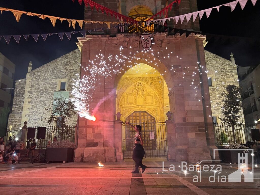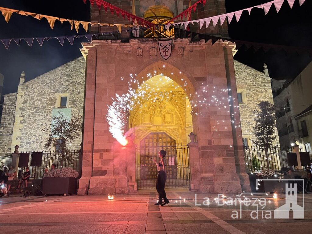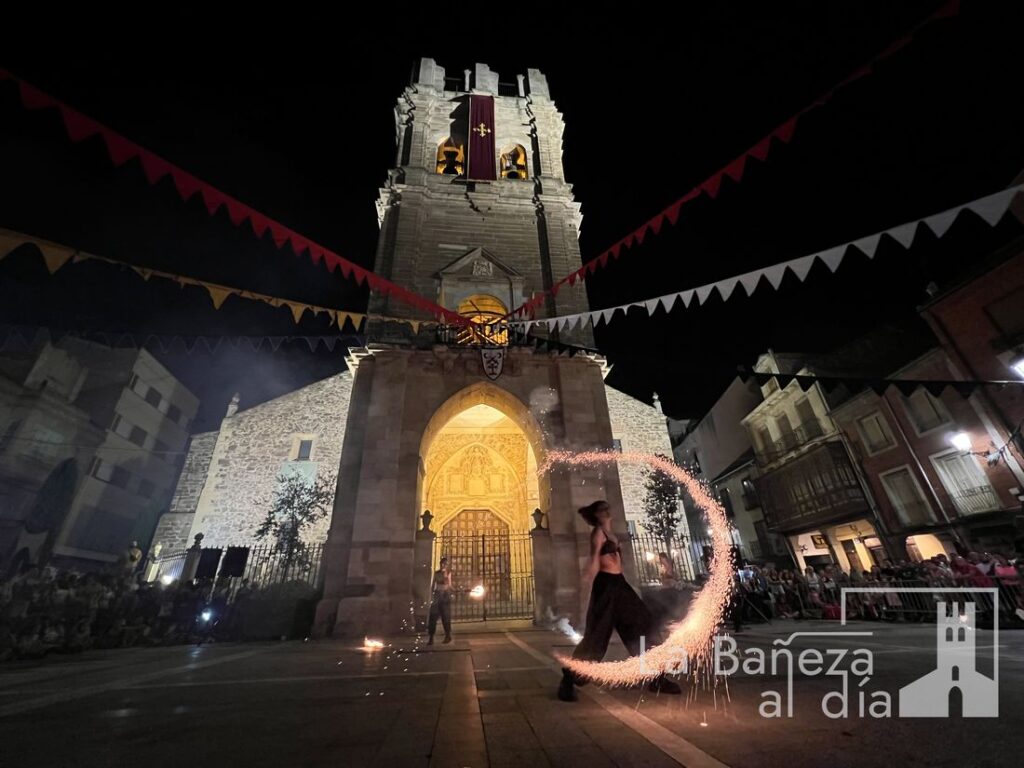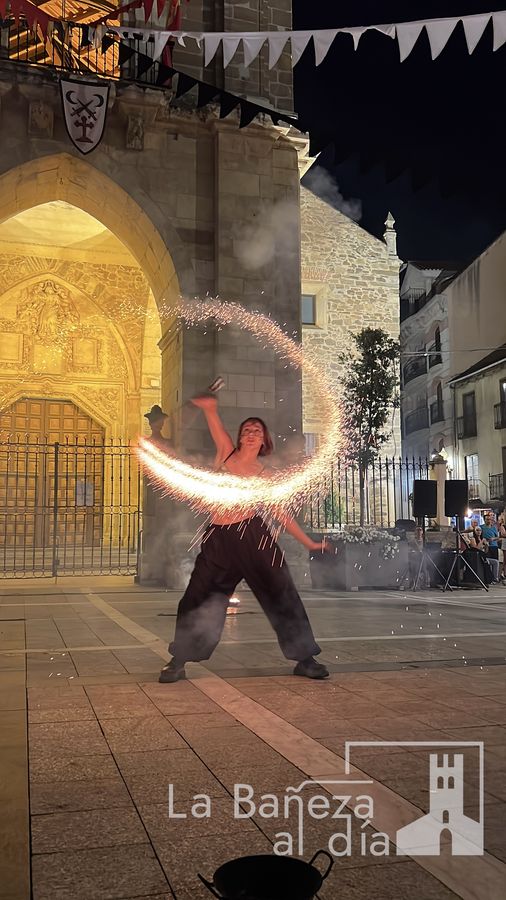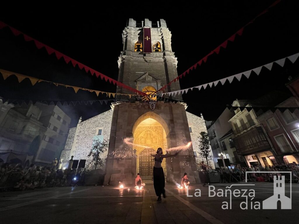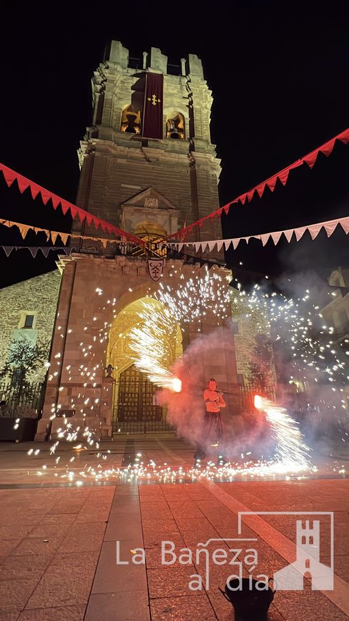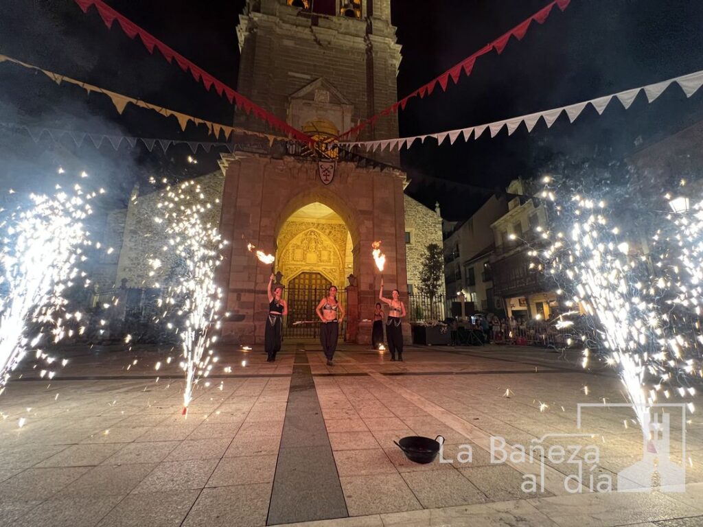 El Mercado Medieval de La Bañeza arrancó este martes con un ambiente festivo que ha llenado la ciudad de color, historia y actividades para todos los públicos. Uno de los momentos más esperados tuvo lugar en la noche de este miércoles, cuando la Plaza Mayor se transformó en el escenario de un espectáculo nocturno de fuego y pirotecnia que dejó impresionados a los asistentes.