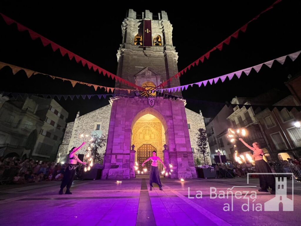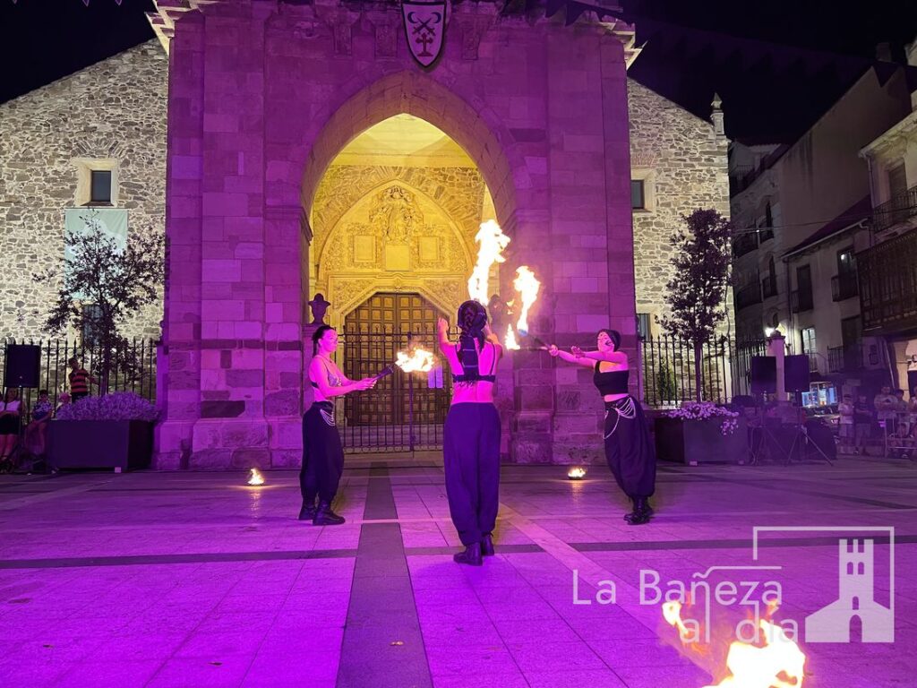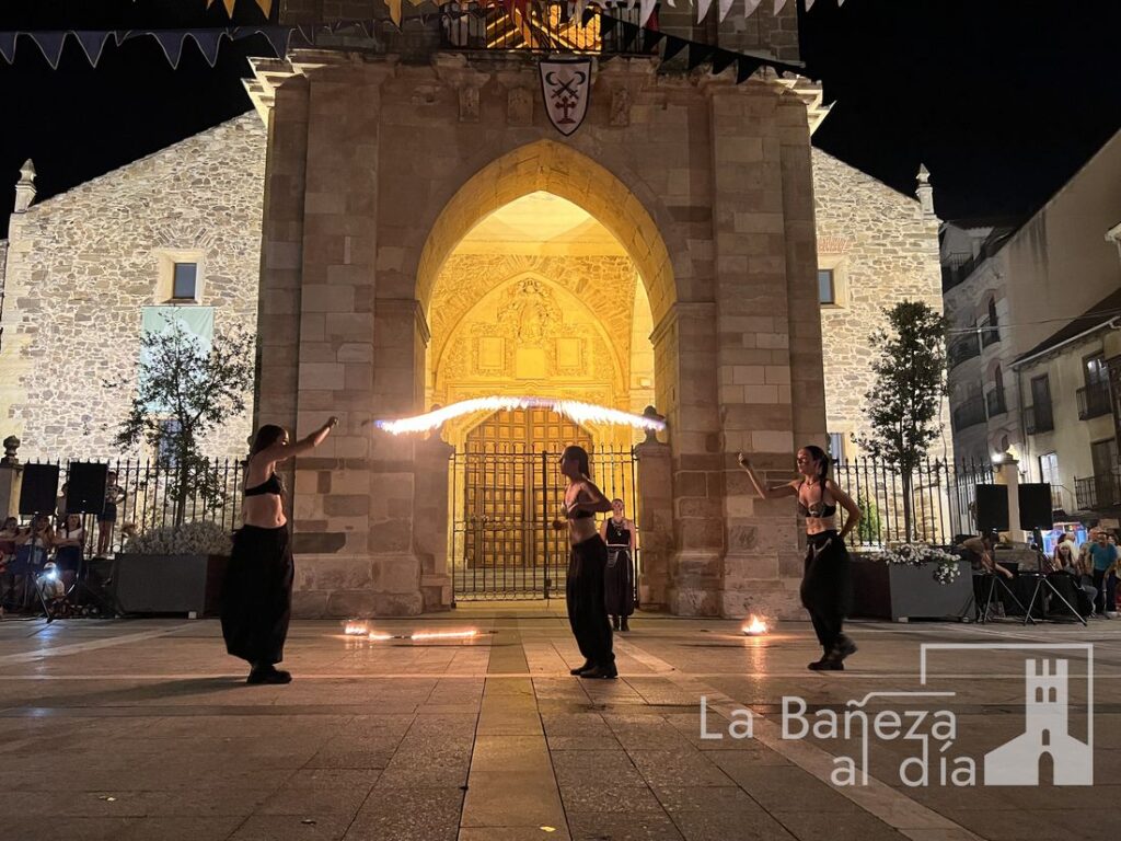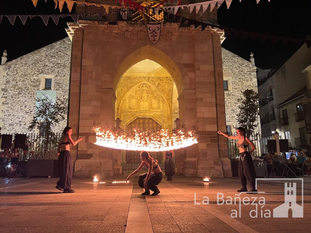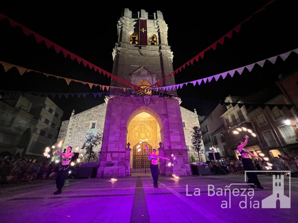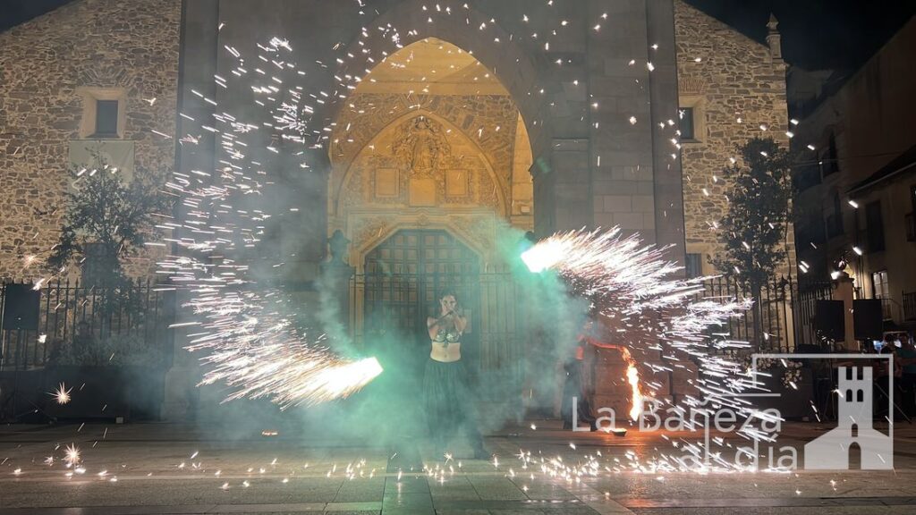 El Mercado Medieval de La Bañeza arrancó este martes con un ambiente festivo que ha llenado la ciudad de color, historia y actividades para todos los públicos. Uno de los momentos más esperados tuvo lugar en la noche de este miércoles, cuando la Plaza Mayor se transformó en el escenario de un espectáculo nocturno de fuego y pirotecnia que dejó impresionados a los asistentes.