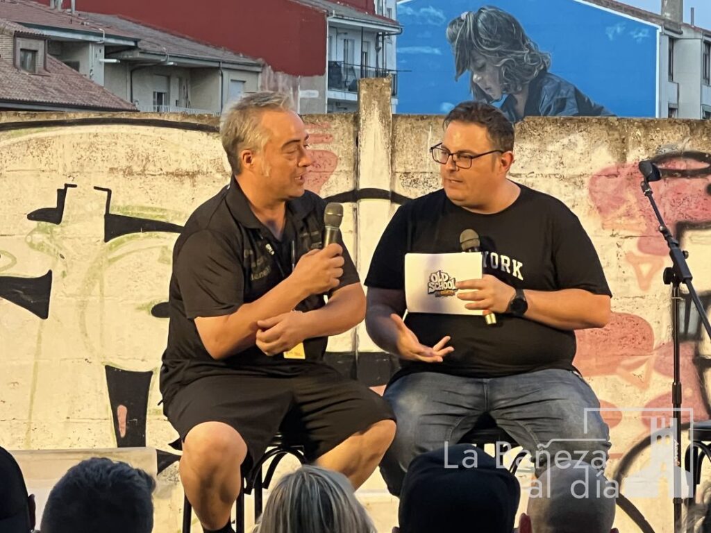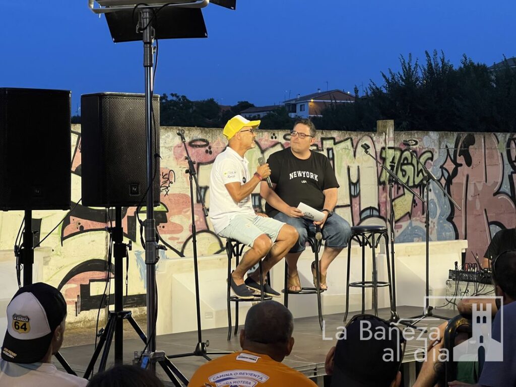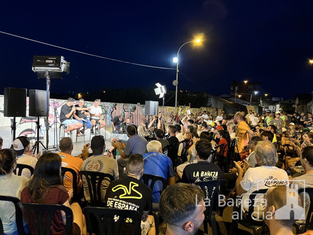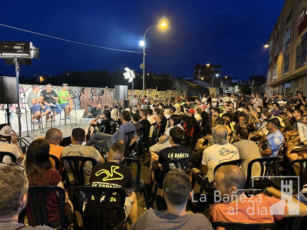 La Bañeza vivió este viernes por la noche una velada para el recuerdo con motivo de la Charla Coloquio 4.0 del Gran Premio de La Bañeza LXIV, organizada por la Peña Old School en la calle Santa Elena, frente al emblemático graffiti de Ángel Nieto.