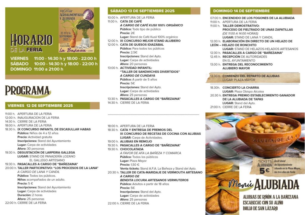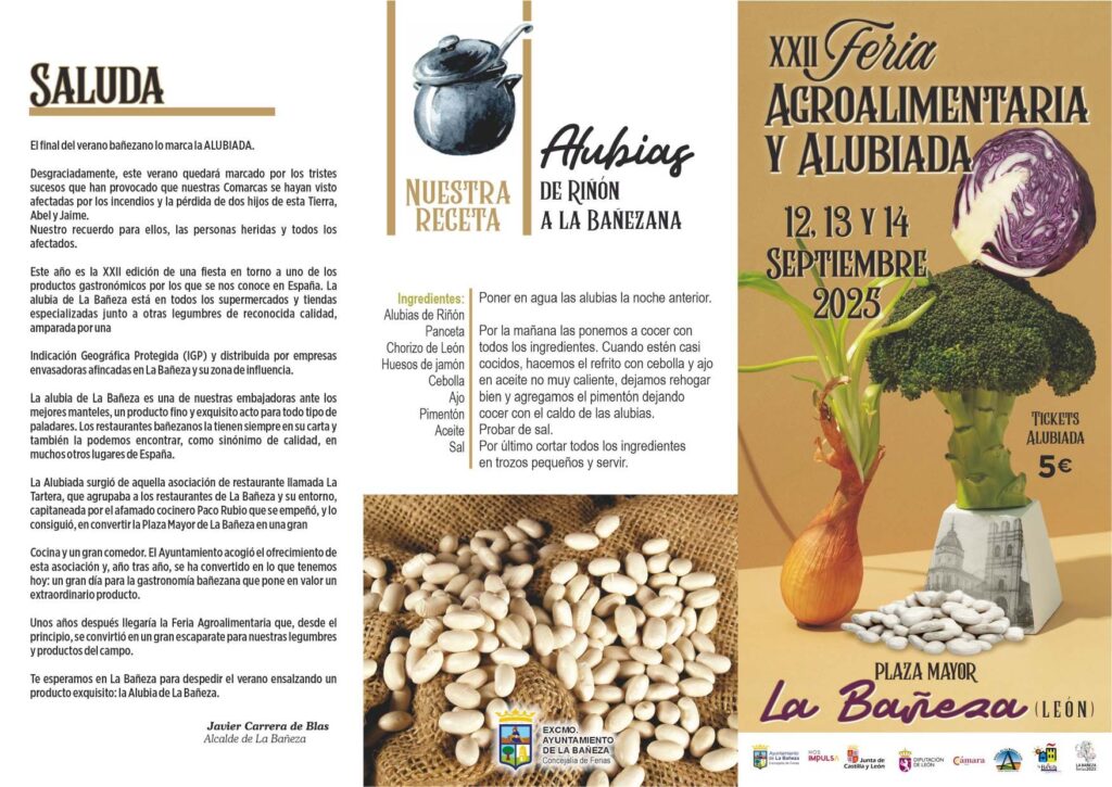 La ciudad de La Bañeza ya calienta motores para celebrar uno de sus eventos más esperados: la XXII Feria Agroalimentaria y Alubiada, que tendrá lugar los días 12, 13 y 14 de septiembre. Este encuentro, consolidado en el calendario bañezano, supone una exaltación de la ciudad, de su historia y de sus comarcas, poniendo en valor el campo, la agricultura y, de manera especial, la alubia, producto emblemático que ha dado renombre a la localidad.