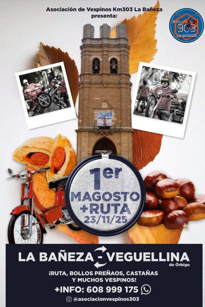 La Asociación de Vespinos Km303 de La Bañeza celebrará el próximo domingo 23 de noviembre su primer “Magosto más Ruta”, una jornada que promete diversión y tradición sobre dos ruedas. La cita combinará una ruta motera con buena comida, castañas, bollos preñaos y el característico ambiente vespinero.