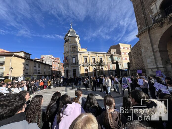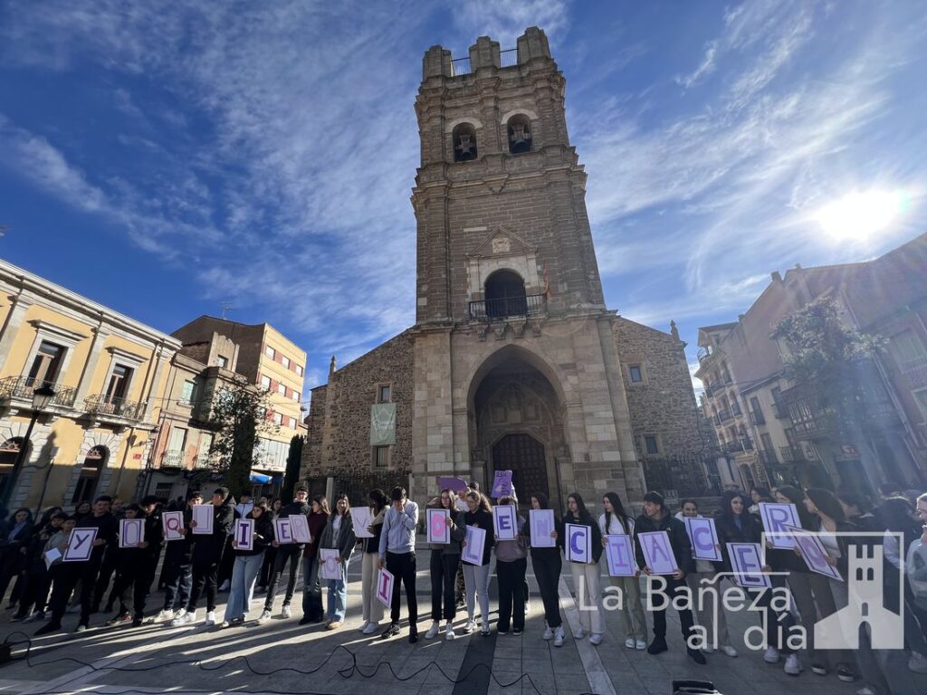 La plaza Mayor de La Bañeza acogió esta mañana el acto institucional con motivo del Día Internacional para la Eliminación de la Violencia de Género, en el que alumnado de los centros de educación secundaria de la ciudad fue el encargado de dar lectura a distintos manifiestos. Representantes de cada instituto leyeron sus discursos y, al finalizar, formaron con letras la frase “Yo quiero violencia cero”, que presidió el cierre del encuentro.