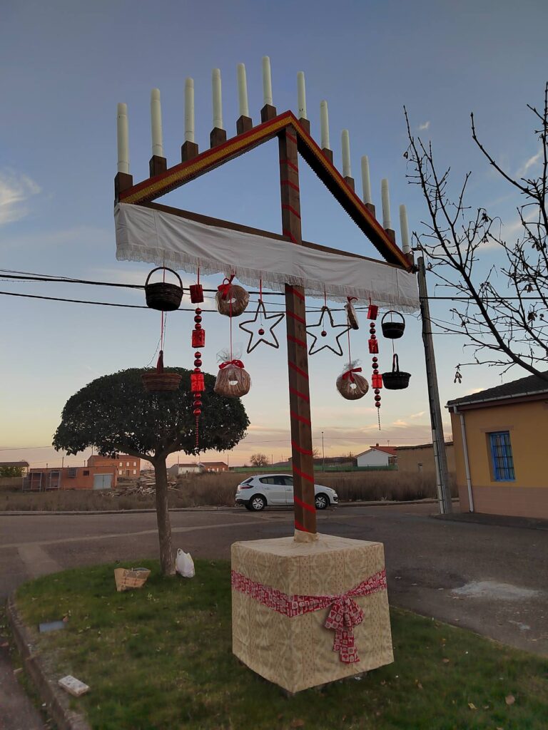 El primer elemento en instalarse fue el gran ramo leonés, estrenado en las navidades anteriores. En esta ocasión, fue decorado con estrellas, panes y cestas, estas últimas donadas por un vecino. Entre las novedades de este año destaca la colocación del nombre del pueblo, confeccionado con palets, así como varias figuras navideñas elaboradas a partir de bidones.