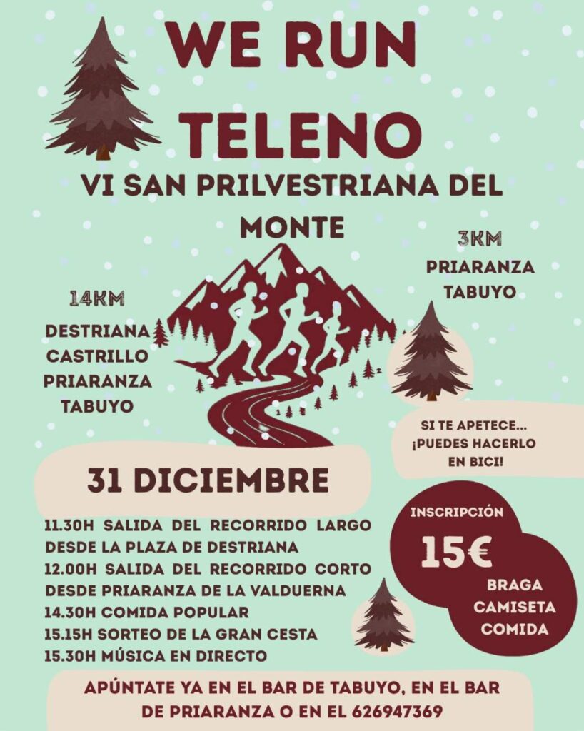 La comarca del Teleno se prepara para celebrar la VI San Prilvestriana del Monte: We Run Teleno, una cita deportiva y social que tendrá lugar el próximo 31 de diciembre y que recorrerá los pueblos de Destriana, Castrillo, Priaranza y Tabuyo del Monte, con dos modalidades de 14 y 3 kilómetros, esta última también abierta a bicicletas para quienes prefieran realizarla sobre dos ruedas.