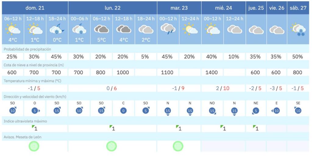 En el caso concreto de La Bañeza, las previsiones apuntan a que las nevadas podrían hacer acto de presencia en las últimas horas de este domingo y durante las primeras horas de la mañana del lunes, con un descenso de la cota de nieve hasta los 600 metros, lo que aumenta la probabilidad de que la nieve llegue a la ciudad y su entorno.