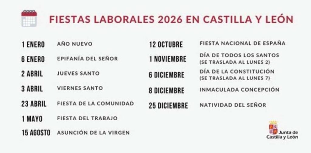 Castilla y León mantendrá como festivo en 2026 el 23 de abril, Día de Castilla y León, que este año cae en jueves, y trasladará al lunes 2 de noviembre la festividad del Día de Todos los Santos –este año el 1 de noviembre cae en domingo– así como el Día de la Constitución, el 6 de diciembre, que también coincide en domingo y pasa al lunes día 7.