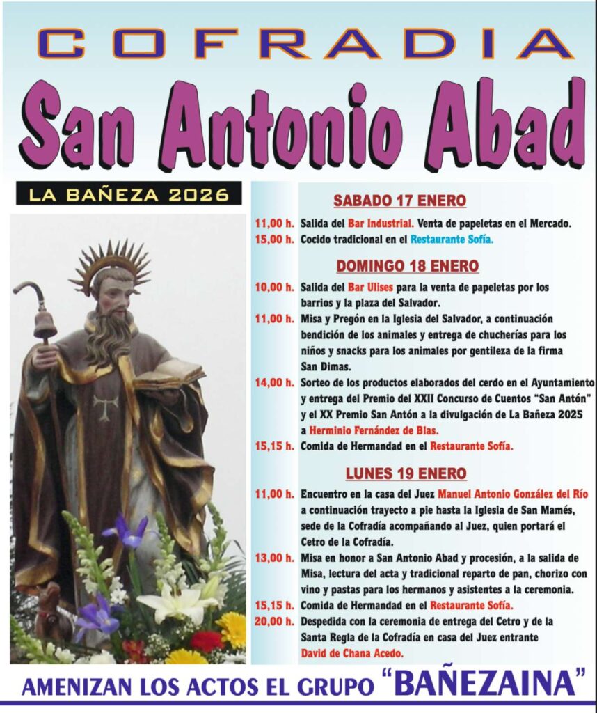 La Cofradía de San Antonio Abad de La Bañeza ha dado a conocer el programa de actos con motivo de la festividad de San Antonio Abad, que se celebrará los días 17, 18 y 19 de enero. San Antón, como es popularmente conocido, se conmemora el 17 de enero y es venerado como patrón de los animales, por lo que esta festividad mantiene una estrecha vinculación con la tradicional bendición de mascotas y ganado.