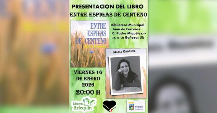 La Biblioteca Municipal de La Bañeza será escenario este viernes, 16 de enero, a las 20.00 horas, de la presentación del libro Entre espigas de centeno, primera novela de la autora leonesa María Ordóñez. El acto se celebrará a través de la Librería Arlequín y está abierto a todos los amantes de la literatura.