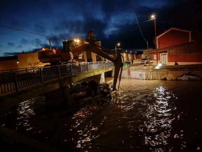 Durante el día de hoy, las excavadoras han estado limpiando los desagües del puente. Además, esta tarde un tronco de grandes dimensiones quedó atravesado en el paso, lo que obligó a intervenir de urgencia con una retroexcavadora para retirarlo debido al peligro que representaba.