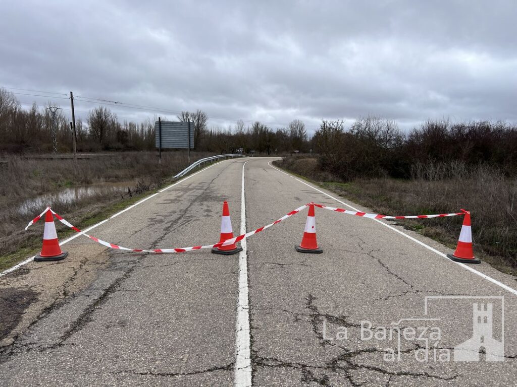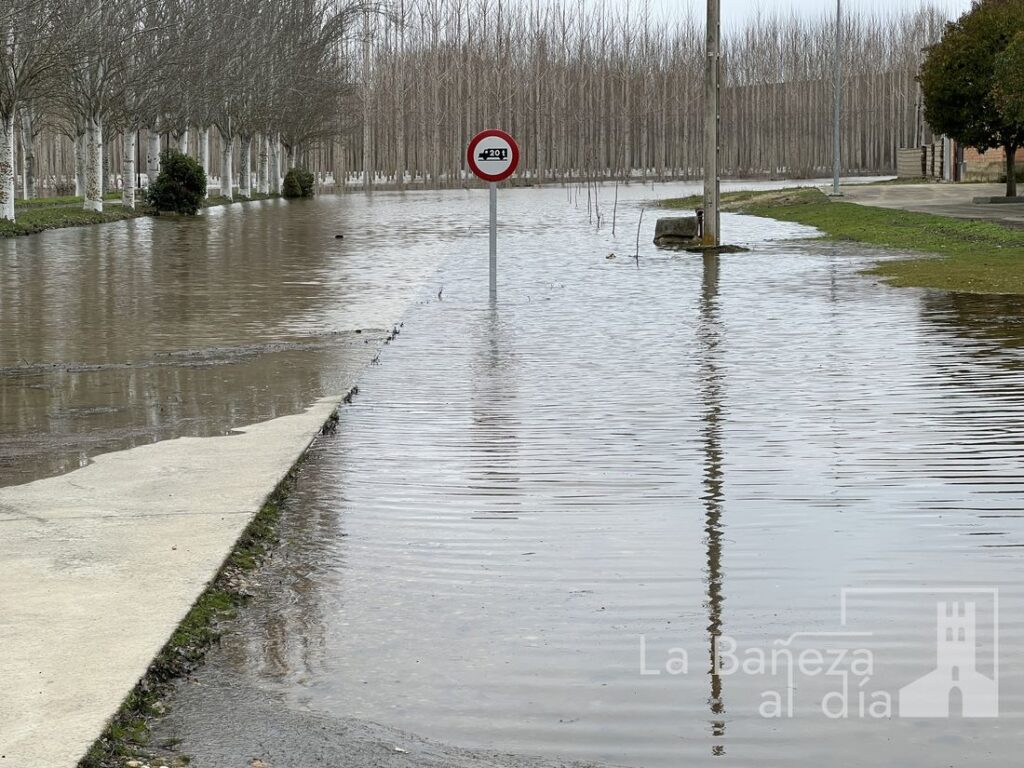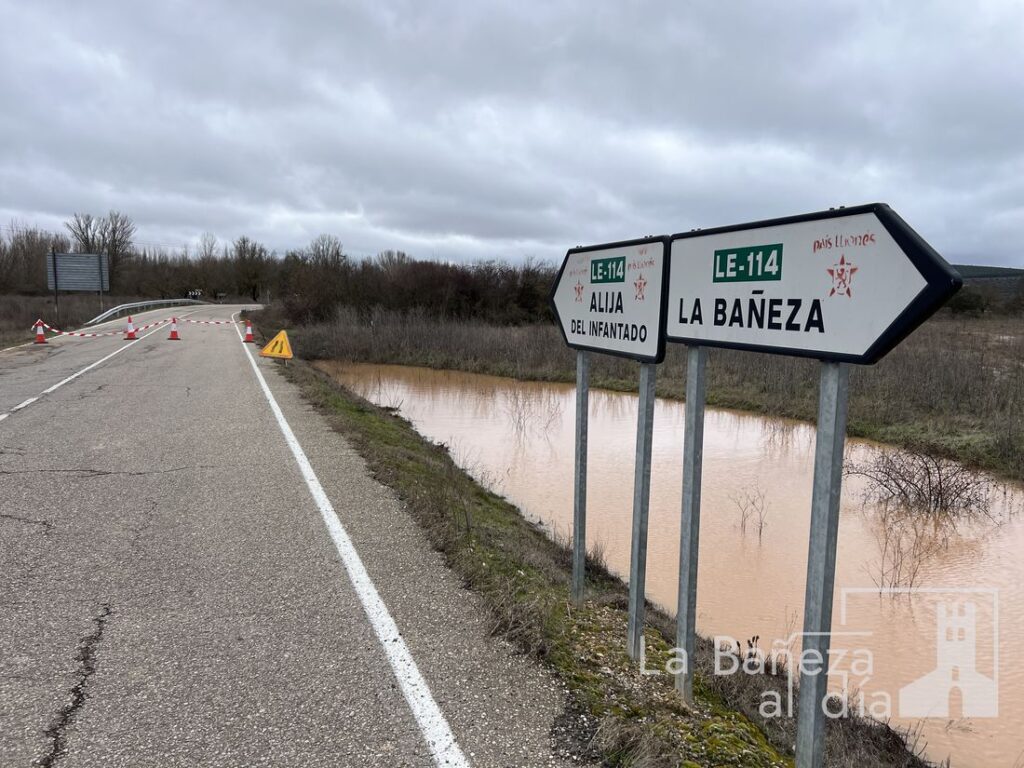 El desbordamiento del río Órbigo ha provocado el corte total de la carretera provincial LE-114 a la altura de La Nora del Río, obligando a cerrar la vía entre los puntos kilométricos 17,5 y 19,5.