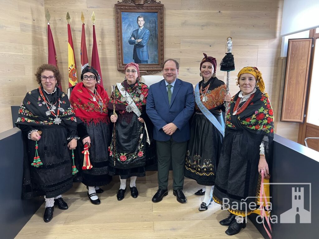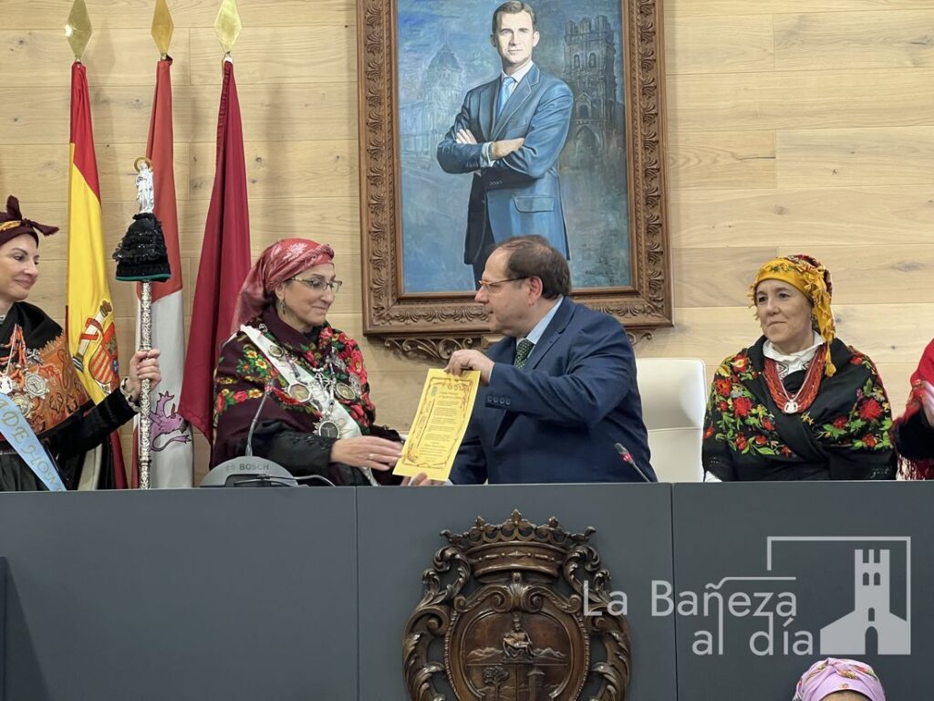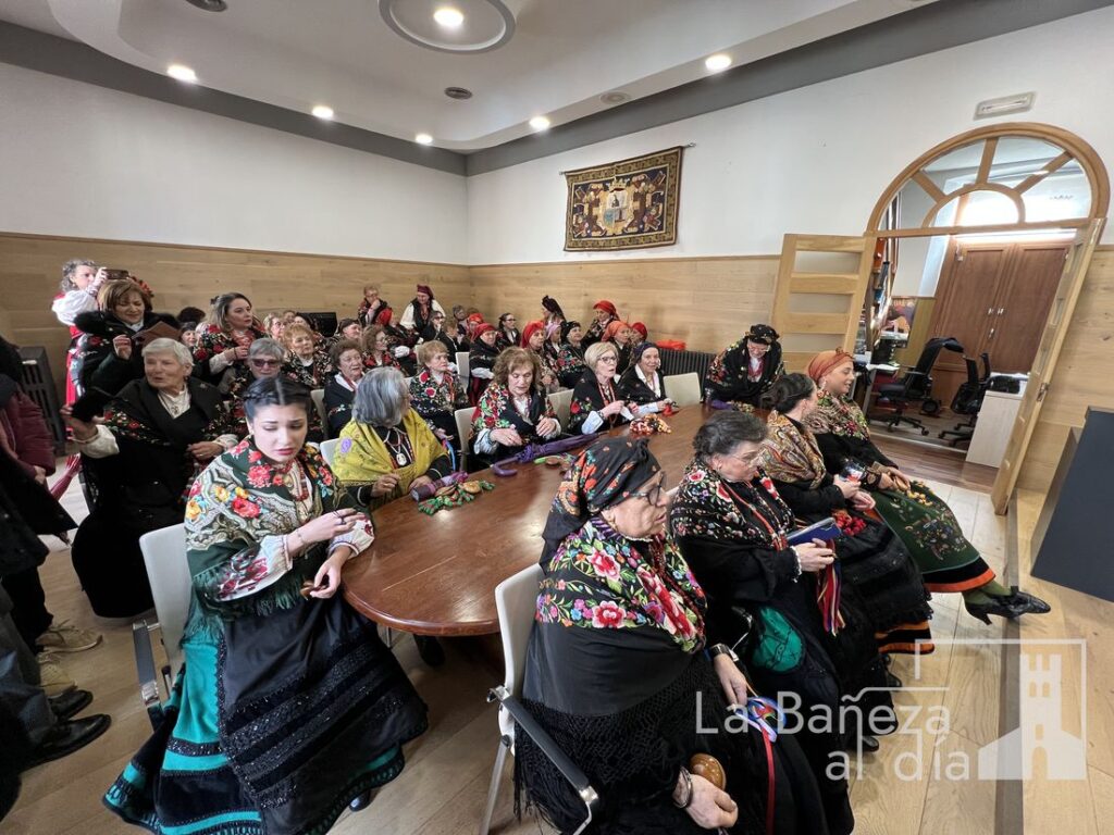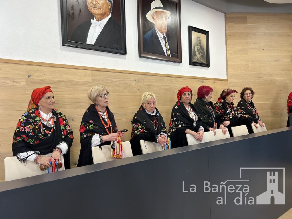A continuación, las Águedas subieron al Salón de Plenos del Ayuntamiento, donde fueron recibidas por el alcalde de La Bañeza, Javier Carrera, para llevar a cabo la tradicional petición del bastón de mando.