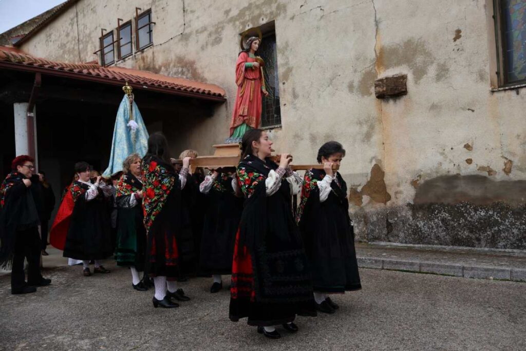 Finalizada la eucaristía, la imagen de la Virgen acompaña a Santa Águeda en la procesión por las calles del pueblo, un acto simbólico que une ambas celebraciones y refuerza el carácter religioso y cultural de la jornada.