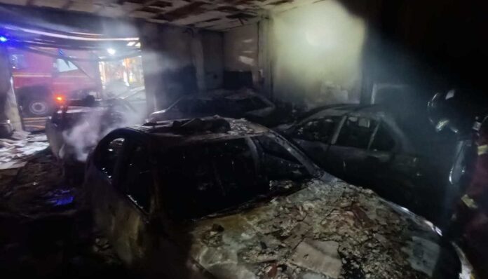 Un incendio declarado en el interior de una cochera con varios vehículos afectados movilizó en la tarde de este viernes a los servicios de emergencia en la calle Manuel Fernández Núñez de La Bañeza.
