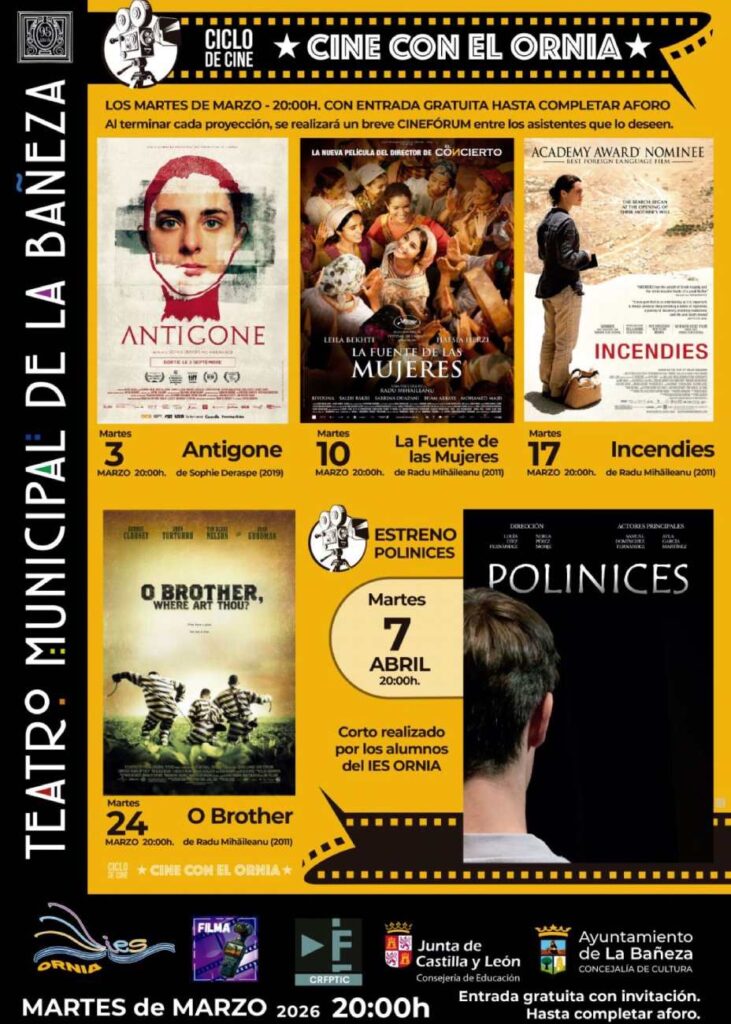 El Teatro Municipal de La Bañeza acogerá durante el mes de marzo el ciclo de proyecciones “Cine con el Ornia”, que podrá disfrutarse todos los martes a las 20:00 horas, con entrada gratuita hasta completar aforo. La iniciativa se ha presentado esta mañana en el propio teatro y culminará el martes 7 de abril, a las 20:00 horas, con la proyección del cortometraje “Polinices”, realizado por alumnado del IES Ornia y dirigido por Lucía Díez Fernández y Nerea Pérez Monje.