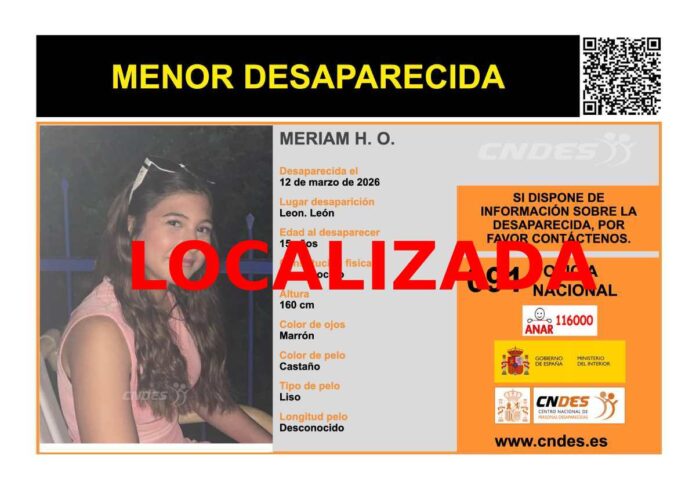 La menor, identificada como Meriam H.O., de 15 años, había sido vista por última vez el pasado 12 de marzo en la capital leonesa. Según la descripción difundida en la alerta, mide aproximadamente 160 centímetros, tiene los ojos marrones y el cabello castaño y liso.