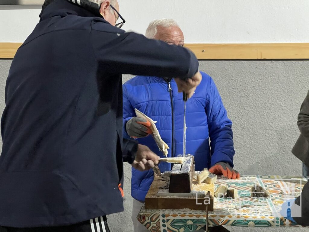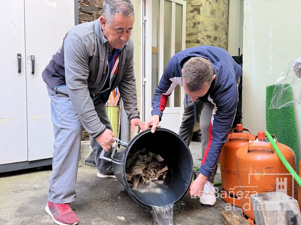 A primera hora de ese lunes, la actividad ya es intensa. Sobre las mesas se apilan los 230 kilos de bacalao, cuyo coste ronda los 4.000 euros. Pieza a pieza, los voluntarios lo trocean cuidadosamente antes de sumergirlo en cubos de agua para su correcta preparación. Es solo el primer paso de una receta que requiere precisión y experiencia.