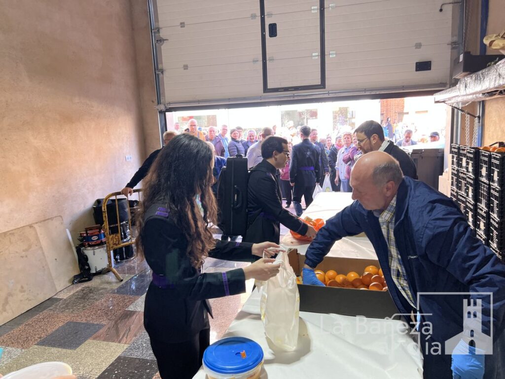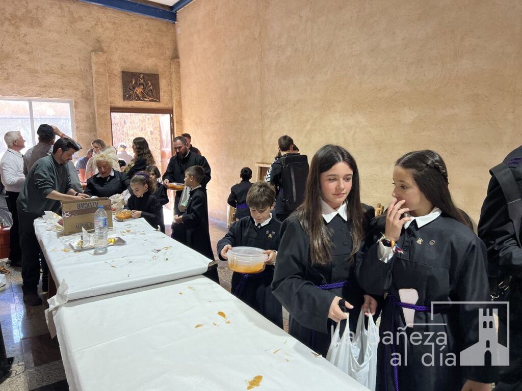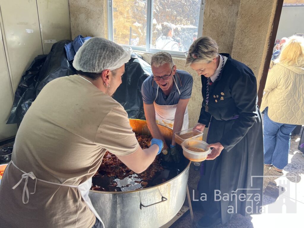 Tras la procesión, llegó uno de los momentos más esperados: la degustación del tradicional potaje. Antes de iniciar el reparto, el sacerdote Álvaro Lobato ofreció una oración por los miembros de la cofradía, presentes y ausentes, y bendijo el guiso al son del popular cántico: