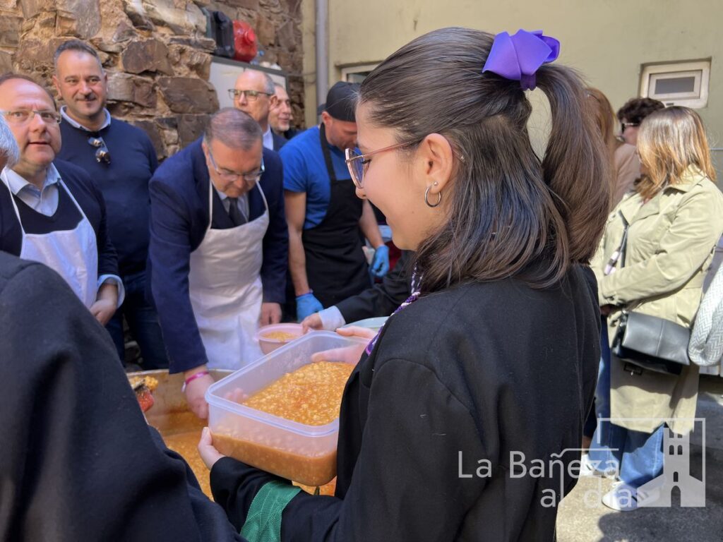 A continuación, cientos de personas aguardaron pacientemente su turno, fiambrera en mano, formando largas colas para recoger una ración del ya famoso potaje. Este año, la cofradía elaboró comida para más de 4.000 comensales, utilizando 300 kilos de garbanzos, 210 de bacalao y 120 de arroz, en un proceso que comenzó el pasado Lunes Santo y que se ha llevado a cabo de manera minuciosa.