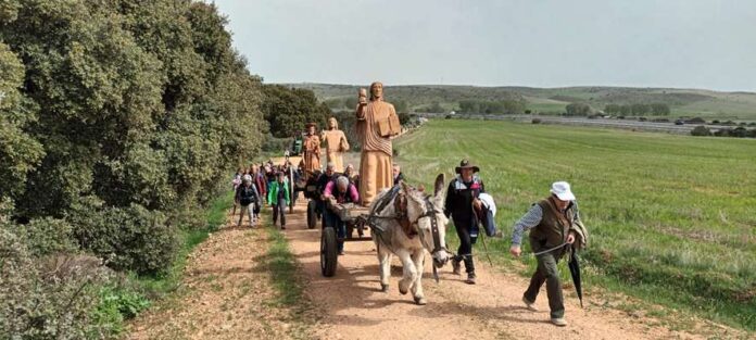 A las 12:15 horas dio comienzo la caminata, organizada en un orden establecido para garantizar la seguridad: abrían la comitiva los coches y caballos, seguidos de tractores y burros que transportaban las esculturas, y cerraban los romeros a pie. El recorrido transcurrió junto a la histórica Ruta de la Plata, donde aún se conservan miliarios y restos visibles de la calzada romana.