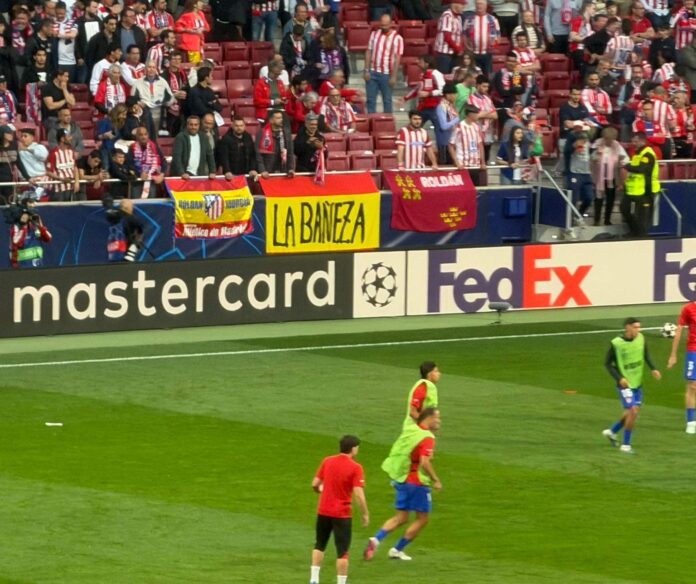 Una bandera con el nombre de La Bañeza se dejó ver este martes 14 de abril en el estadio Riyadh Air Metropolitano durante uno de los encuentros más destacados de la jornada, el que enfrentó al Atlético de Madrid y al FC Barcelona.