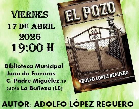 La Biblioteca Municipal Juan de Ferreras de La Bañeza acogerá este viernes 17 de abril, a partir de las 19:00 horas, la presentación del libro El pozo, la nueva obra del autor leonés Adolfo López Reguero. El acto contará con la participación de Antonio Odón Alonso y Patricia González, encargados de conducir la presentación, y se celebrará gracias a la colaboración de Librería Arlequín, Más que Libros y el Ayuntamiento de La Bañeza.