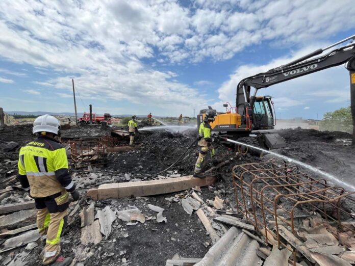 Tres dotaciones de bomberos del Servicio de Prevención, Extinción de Incendios y Salvamento (SEPEIS) de la Diputación de León han trabajado durante toda la jornada de este lunes para lograr la extinción total del incendio declarado el pasado 18 de marzo en la nave de plásticos de La Bañeza.